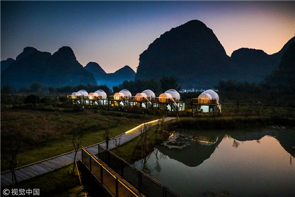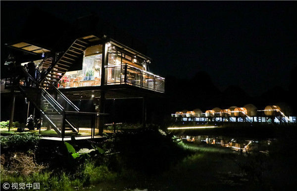 “泡泡屋”列陣陽朔河畔 游客可躺在床上看星星