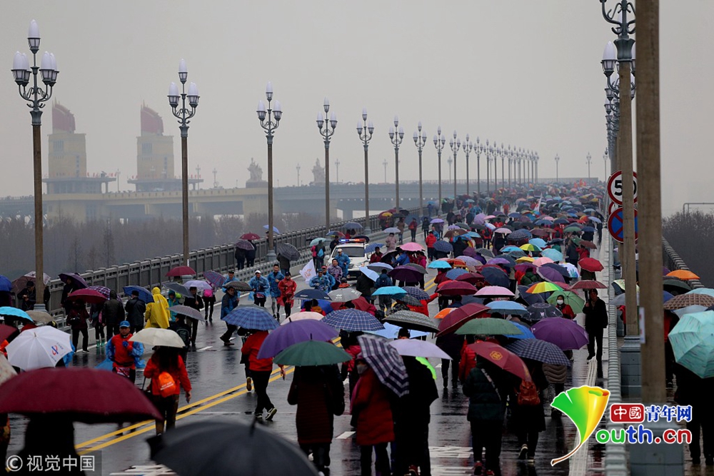 2018年12月26日,南京。南京長(zhǎng)江大橋維修改造工程竣工通車在即,12月26日至28日三天向公眾開放,12月26日,“市民開放日”首日,早晨九時(shí)許,雖然下著雨,但記者在南京長(zhǎng)江大橋入口和橋上看到,如織的市民打著傘來(lái)到大橋,整個(gè)橋上全是撐傘觀看的市民,足有萬(wàn)人,十分壯觀。