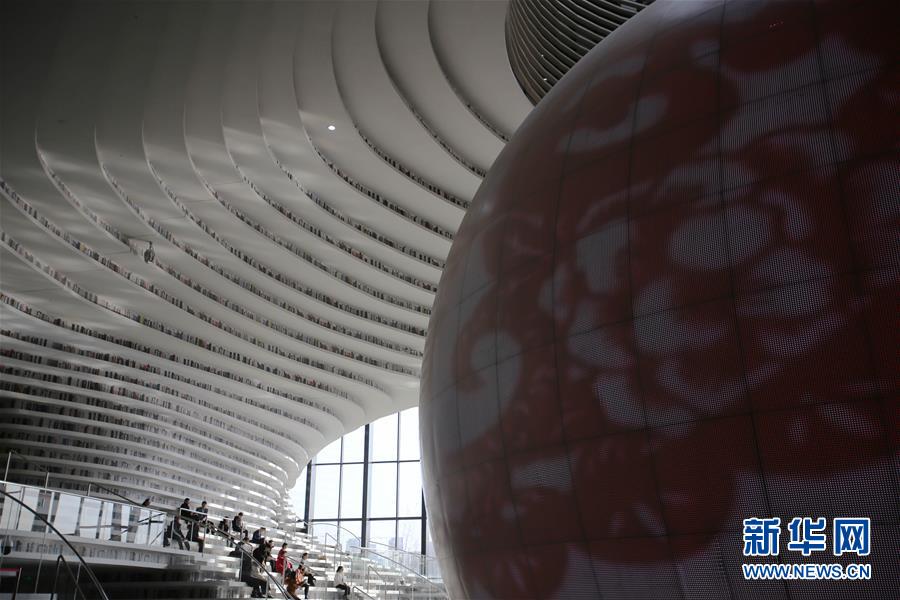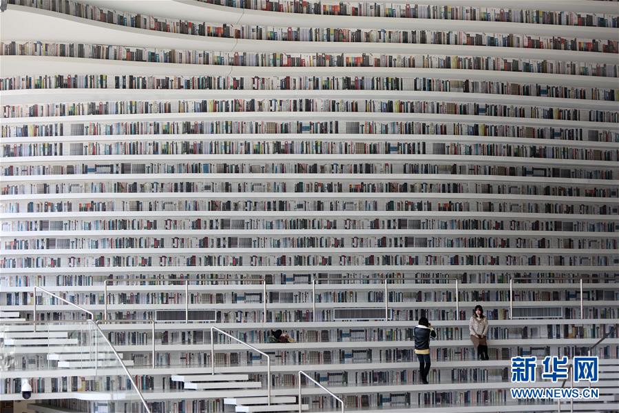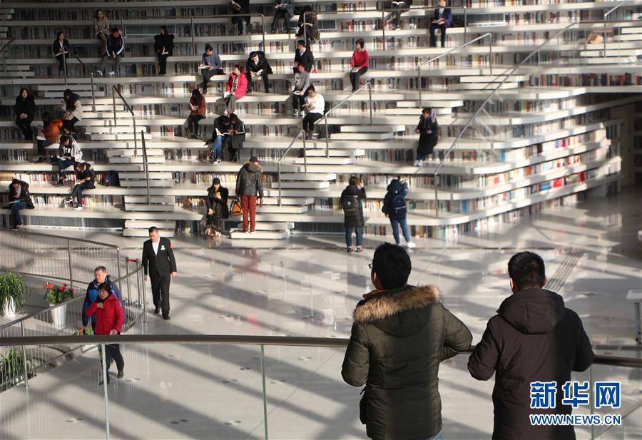12月27日,讀者在天津?yàn)I海新區(qū)圖書(shū)館的“書(shū)山”上參觀。 濱海新區(qū)圖書(shū)館位于天津?yàn)I海文化中心,2017年10月1日正式開(kāi)館,設(shè)計(jì)立意為“濱海之眼”和“書(shū)山有路勤為徑”。圖書(shū)館現(xiàn)有藏書(shū)60多萬(wàn)冊(cè),一年多來(lái)接待讀者約280萬(wàn)人次,已成為濱海新區(qū)的文化“新地標(biāo)”。 新華社記者段卓力攝
