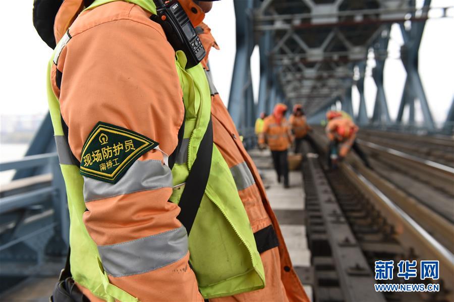 線路工們?cè)谀暇╅L(zhǎng)江大橋鐵路橋進(jìn)行木枕改道作業(yè)(12月27日攝)。