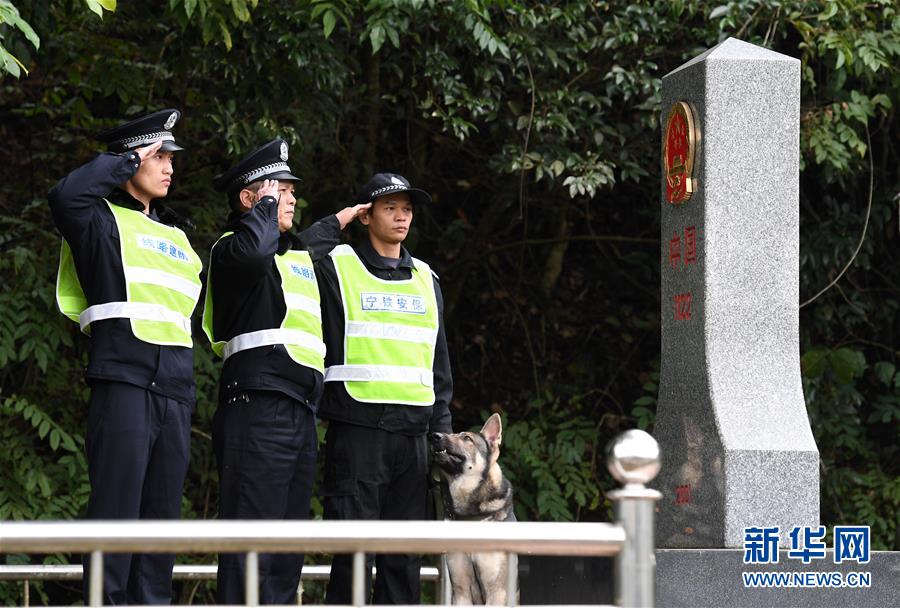 鐵路公安民警陸日峰(左二)和同事在中越邊境巡線時(shí)向界碑敬禮(2018年12月31日攝)。 新華社記者陸波岸攝