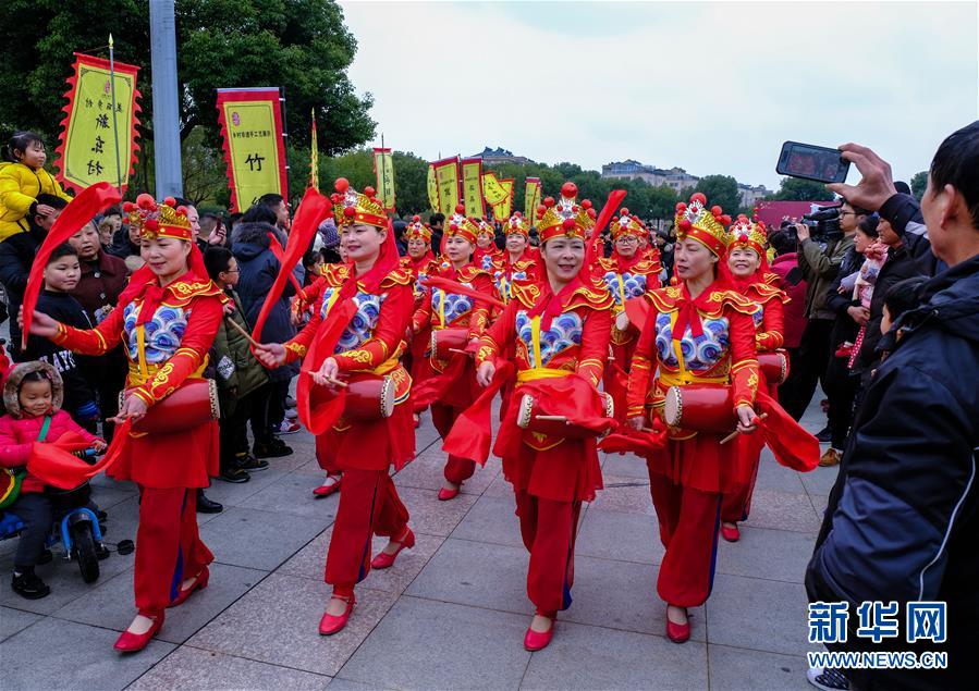 2019年1月1日,演員在展演活動(dòng)上進(jìn)行腰鼓表演。2019年元旦,浙江省桐鄉(xiāng)市濮院鎮(zhèn)舉辦新年“非遺文化藝術(shù)節(jié)”活動(dòng),濮院鎮(zhèn)下屬多個(gè)鄉(xiāng)村的傳統(tǒng)美食制作、手工藝品、非遺文化表演等鄉(xiāng)村特色非遺項(xiàng)目在濮院鎮(zhèn)中心廣場(chǎng)進(jìn)行集中展示展演。新華社記者 徐昱 攝