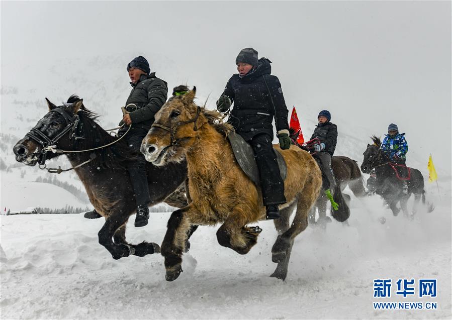 1月1日,在新疆禾木雪鄉(xiāng),當?shù)鼐用癖硌菅┑刭愸R。