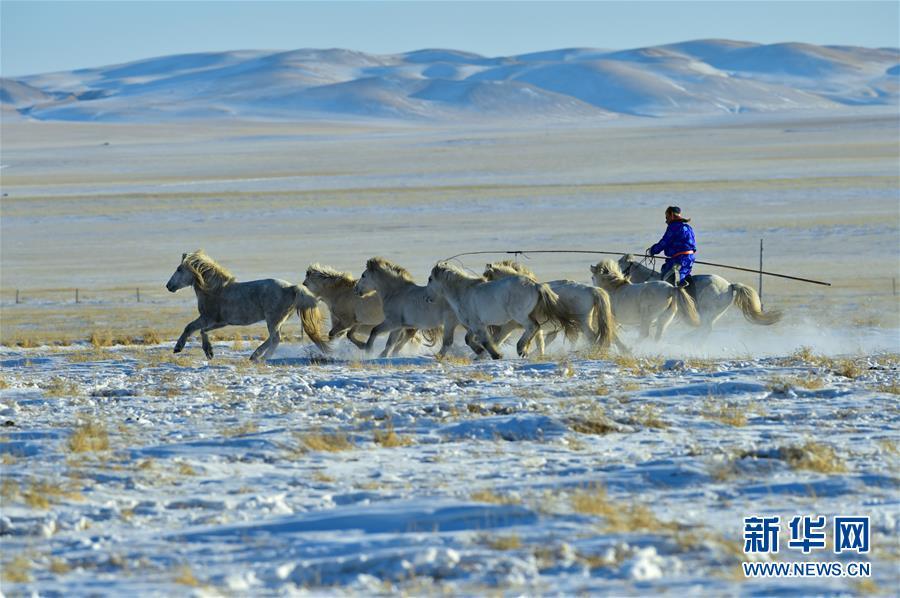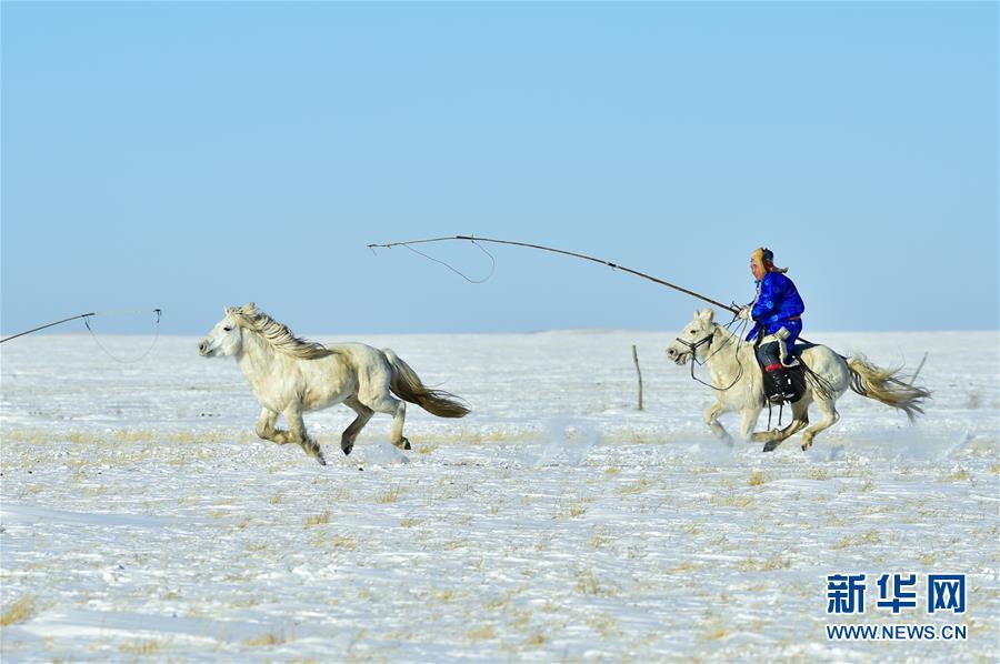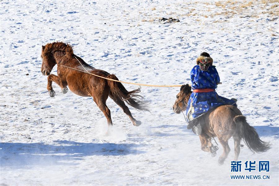 1月8日,牧民進(jìn)行套馬表演。 時(shí)下正值草原冬季旅游旺季,內(nèi)蒙古自治區(qū)西烏珠穆沁旗的牧民們?cè)谘┰弦徽股硎?,為游客展現(xiàn)獨(dú)特的民族風(fēng)情。 新華社記者 劉磊 攝