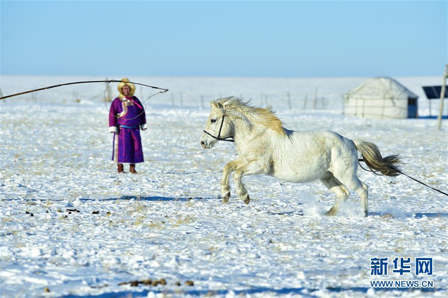 1月8日,牧民在馴服一匹烈馬。 時(shí)下正值草原冬季旅游旺季,內(nèi)蒙古自治區(qū)西烏珠穆沁旗的牧民們?cè)谘┰弦徽股硎郑瑸橛慰驼宫F(xiàn)獨(dú)特的民族風(fēng)情。 新華社記者 鄒予 攝