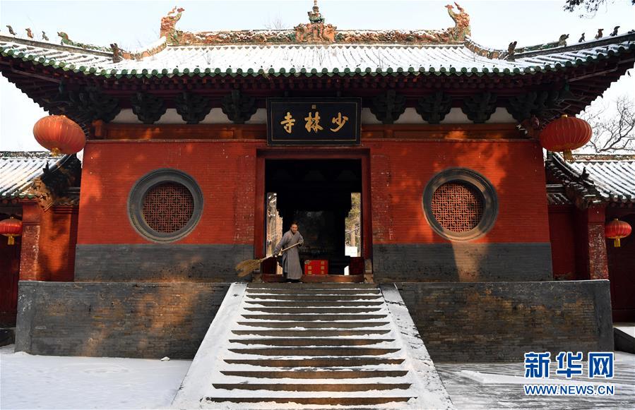 1月10日,一位僧人在少林寺內清掃積雪。當日,雪后初霽,河南登封少林寺分外秀美。 新華社記者 李嘉南 攝