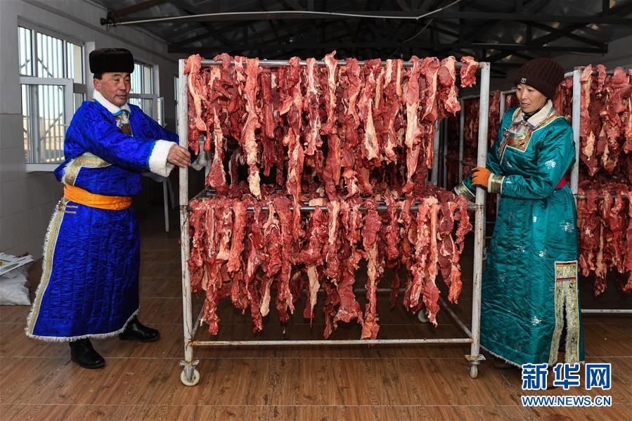1月9日,牧民伊拉代(左)和妻子斯琴高娃在風(fēng)干室內(nèi)擺放掛滿牛肉的鐵架。