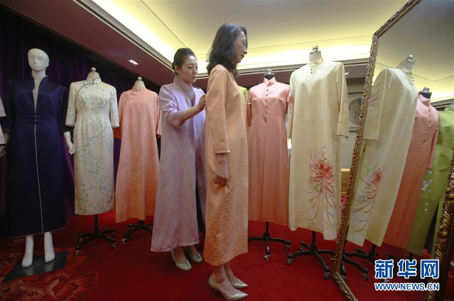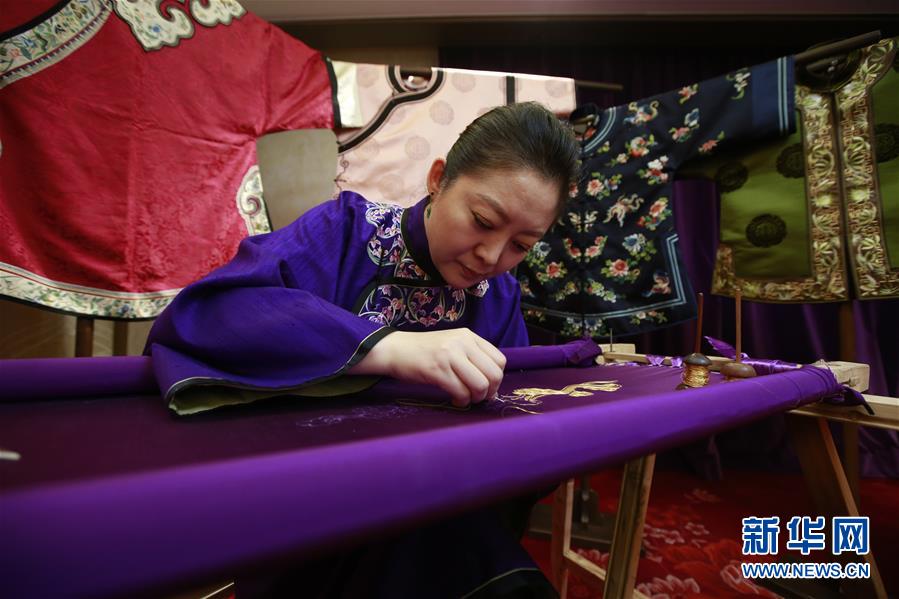 1月12日,在北京“碧泓云想”服裝設(shè)計(jì)工作室,高定服裝設(shè)計(jì)師畢紅在為中式服裝制作刺繡紋樣。畢紅設(shè)計(jì)的中式服裝以棉、麻、真絲等面料為主。春節(jié)來臨,其團(tuán)隊(duì)加班加點(diǎn)為顧客趕制中式服裝。