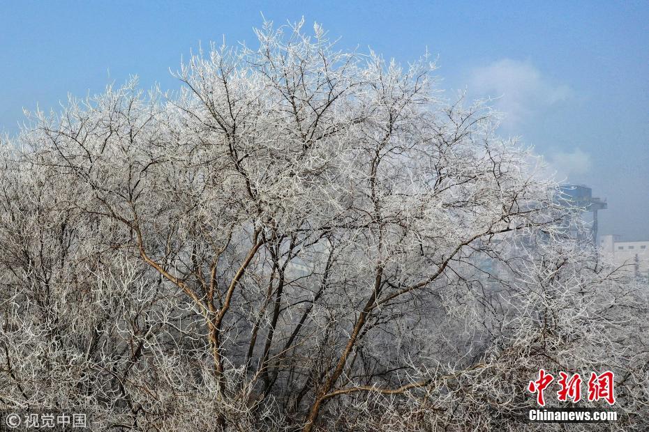 1月13日,霧散日升。河北省邢臺(tái)市大街小巷的樹(shù)枝上掛滿了潔白晶瑩的霜花,藍(lán)天下微風(fēng)吹拂銀絲閃爍,奇麗壯觀。給臘八節(jié)日增添了亮麗的風(fēng)景。霍紅軍 攝 圖片來(lái)源:視覺(jué)中國(guó)