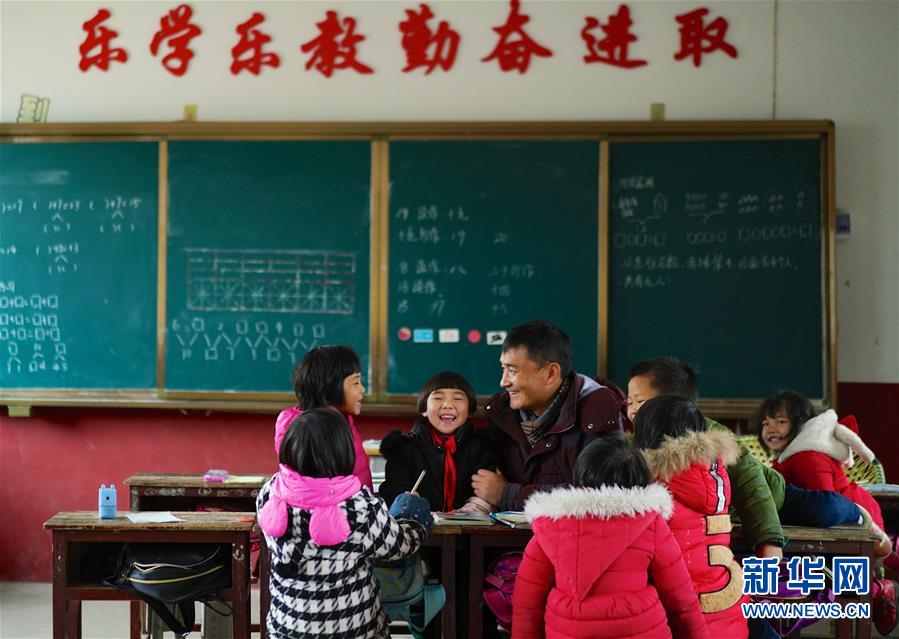 1月3日,章站亮利用課間時間給學生們講故事。由于黃泥村地處偏遠,學生的父母長期不在家,章站亮的故事幾乎成為了學生了解外界社會的重要方式。 新華社記者 胡晨歡 攝