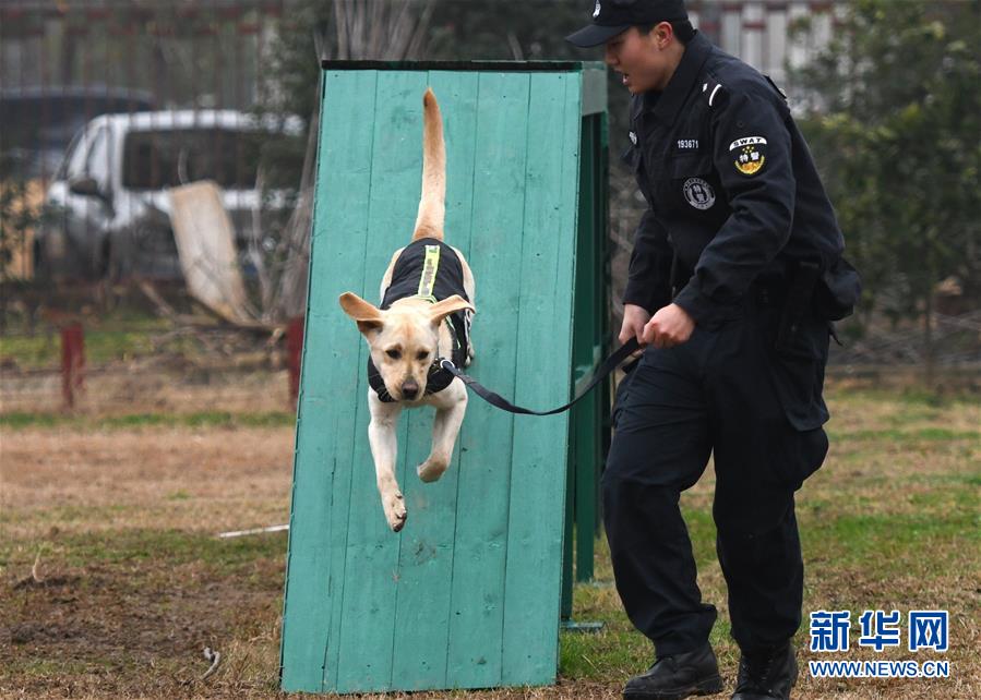 1月15日,警犬“皮特”在訓(xùn)導(dǎo)員丁巖的帶領(lǐng)下進(jìn)行崗前特訓(xùn)。新華社記者 程敏 攝