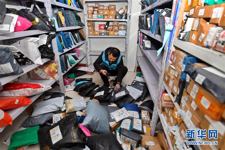 在山西省太原市富士康科技工業(yè)園的一家快遞驛站里,站長張新在整理快遞架(1月15日攝)。
