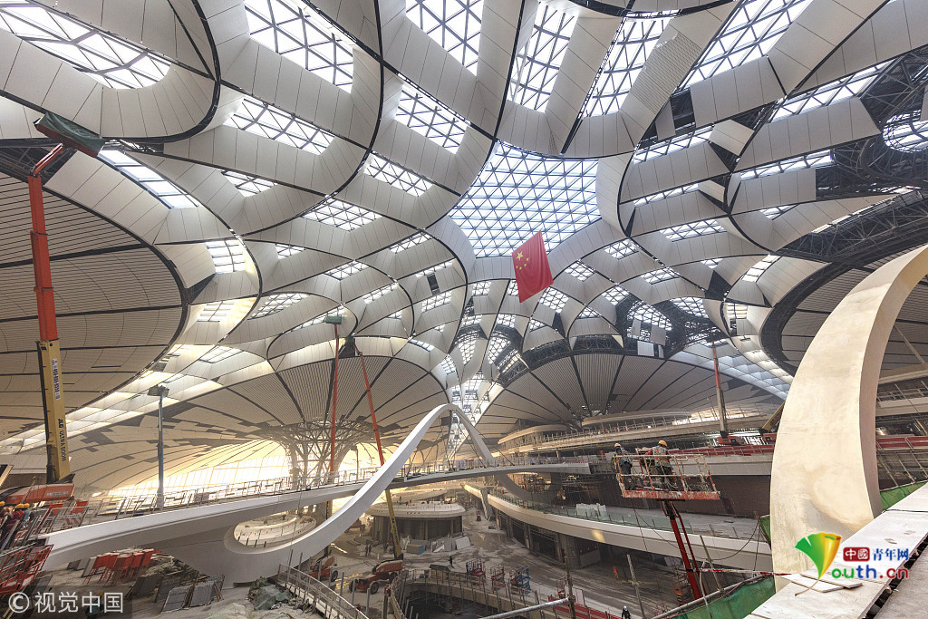 2018年12月19日,北京大興國際機(jī)場航站樓的屋面已基本完工,一只金色“鳳凰”完整地出現(xiàn)在北京城南。航站樓的室內(nèi)裝修在有條不紊的推進(jìn)中。