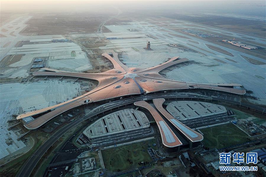 俯瞰北京大興國際機場(2018年12月29日無人機拍攝)。 歲末年初,寓意“鳳凰展翅”的北京大興國際機場航站樓外立面裝修工程全面完成,正式對外完整亮相。“航站樓內部精裝修和設備安裝已完成80%;高速公路主體結構工程基本完工;綜合管廊正加快推進建設……”1月3日,北京市發(fā)展改革委對外公布北京大興國際機場及其配套設施建設的最新進展。 新華社記者 鞠煥宗 攝