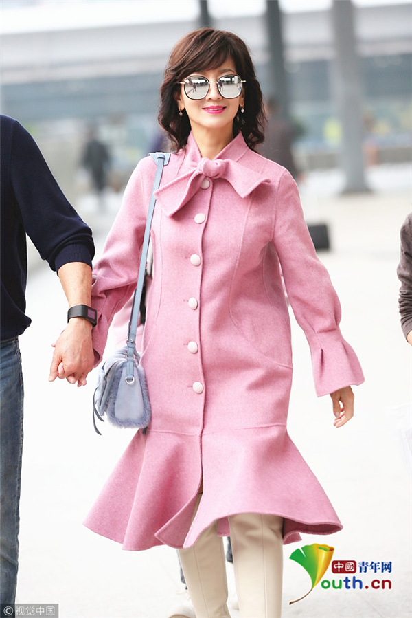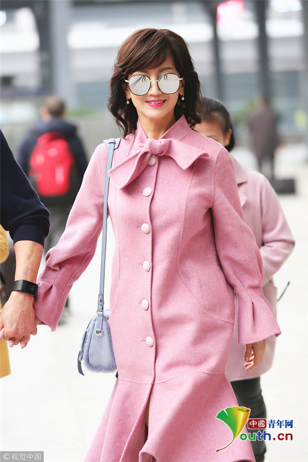 1月22日,廣東深圳,近日,趙雅芝與丈夫黃錦燊現(xiàn)身機場,黑超遮面的她身著粉色昵子魚尾大衣,氣質超群,一路獲粉絲跟隨,共先生黃錦燊牽手同行。
