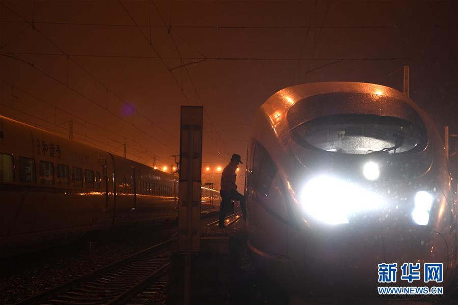 1月29日,王瑞在合肥南動(dòng)車(chē)運(yùn)用所登上一輛動(dòng)車(chē)準(zhǔn)備調(diào)車(chē)作業(yè)。新華社記者劉軍喜攝