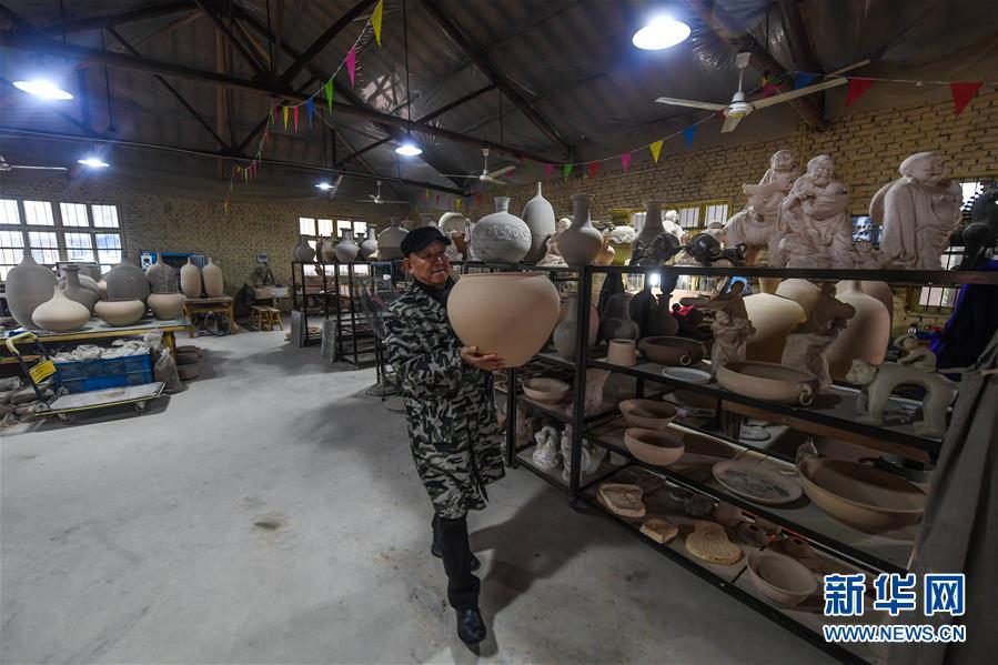 2月16日,陳新華拿著一個(gè)素坯準(zhǔn)備進(jìn)入下一步工序。新華社記者 徐昱 攝