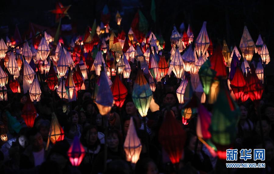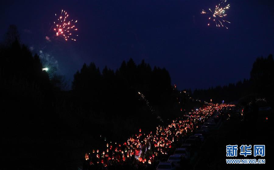 2月18日,群眾在四川省南充市嘉陵區(qū)金寶鎮(zhèn)點(diǎn)亮“蠐蟆燈”。 當(dāng)日是農(nóng)歷正月十四,夜幕降臨后,川渝等地?cái)?shù)萬名群眾在四川省南充市嘉陵區(qū)金寶鎮(zhèn)匯聚,點(diǎn)亮“蠐蟆燈”,敲著鑼鼓唱著歌謠,將“蠐蟆”送到幾公里外的田邊或者河邊燒掉,祈福健康平安。星星點(diǎn)點(diǎn)的燈光在鄉(xiāng)間小路閃爍移動,場面壯觀熱烈。 “送蠐蟆”祈福這一習(xí)俗源于清朝,歷經(jīng)演變成為川東北地區(qū)一個古老而神秘的地方民俗節(jié)日。 新華社記者 江宏景 攝