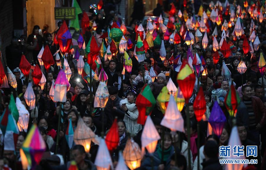2月18日,在四川省南充市嘉陵區(qū)金寶鎮(zhèn),群眾舉著“蠐蟆燈”巡游。 當(dāng)日是農(nóng)歷正月十四,夜幕降臨后,川渝等地?cái)?shù)萬名群眾在四川省南充市嘉陵區(qū)金寶鎮(zhèn)匯聚,點(diǎn)亮“蠐蟆燈”,敲著鑼鼓唱著歌謠,將“蠐蟆”送到幾公里外的田邊或者河邊燒掉,祈福健康平安。星星點(diǎn)點(diǎn)的燈光在鄉(xiāng)間小路閃爍移動,場面壯觀熱烈。 “送蠐蟆”祈福這一習(xí)俗源于清朝,歷經(jīng)演變成為川東北地區(qū)一個古老而神秘的地方民俗節(jié)日。 新華社記者 江宏景 攝