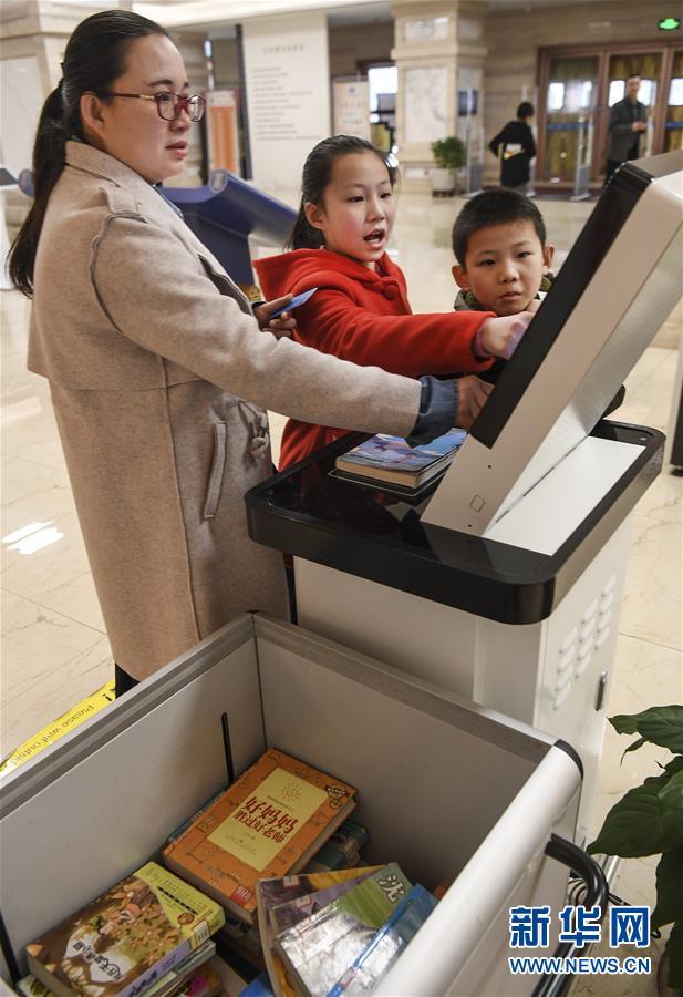 2月24日,一名家長帶孩子在府谷縣圖書館自助借還機(jī)上借閱圖書。 新華社記者 陶明 攝