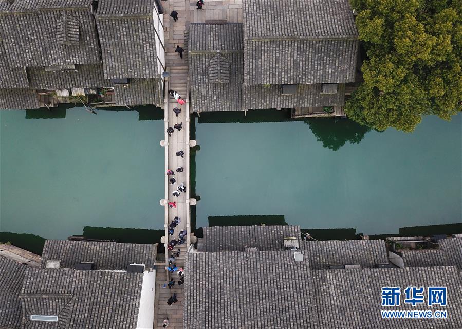 2月25日,游人在烏鎮(zhèn)游覽觀光(無(wú)人機(jī)拍攝)。 隨著氣溫升高,浙江省桐鄉(xiāng)市烏鎮(zhèn)景區(qū)春意萌動(dòng)。 新華社記者翁忻旸攝
