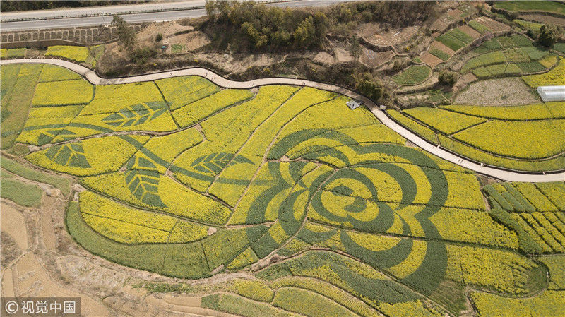 2019年近日,在云南省安寧市山口村,油菜花田里“長(zhǎng)出”一朵巨大的“山茶花”,吸引游客到此觀賞拍照。圖為3月1日,航拍油菜花田中的山茶花圖案。劉冉陽(yáng)(云南分社)/中新社/視覺(jué)中國(guó)