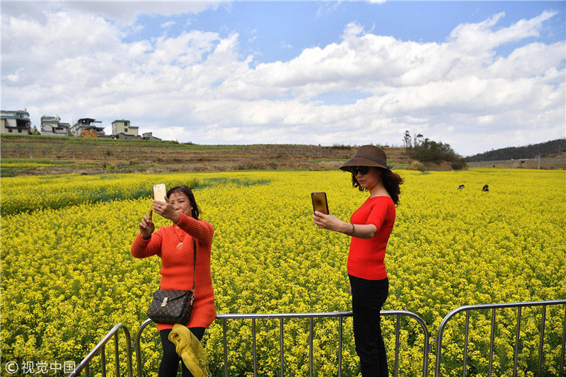 2019年3月1日,游客用手機(jī)拍照。近日,位于云南省安寧市的大片油菜花進(jìn)入盛花期,吸引民眾到此賞花。