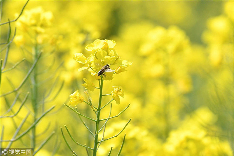 2019年3月1日,蜜蜂在油菜花田里采蜜。近日,位于云南省安寧市的大片油菜花進(jìn)入盛花期,吸引民眾到此賞花。
