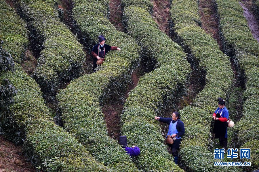 3月17日,采茶工在丹寨縣龍泉鎮(zhèn)馬寨村的茶園里采摘春茶。