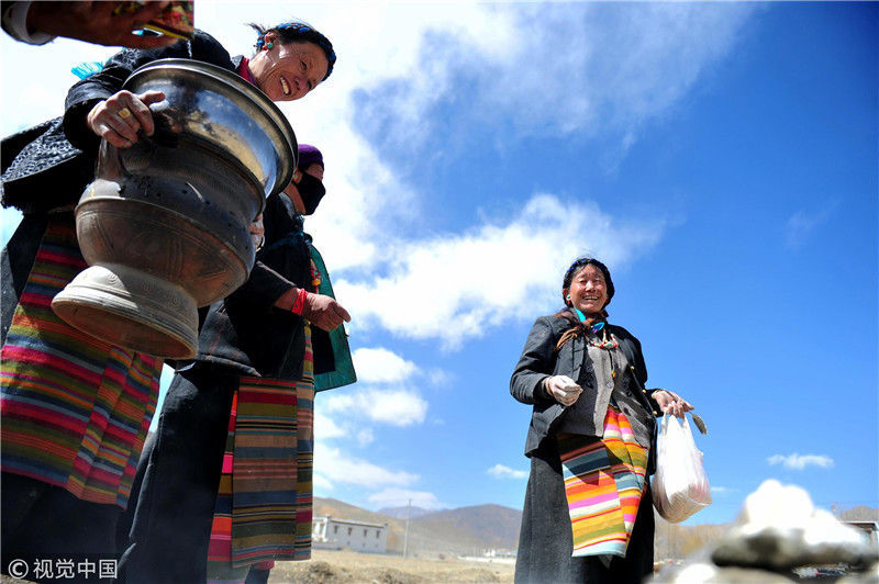 2019年3月16日,西藏各地迎來開耕節(jié)。位于年楚河畔的日喀則白朗縣被譽(yù)為“后藏糧倉”,當(dāng)日,當(dāng)?shù)夭刈遛r(nóng)牧民將家里的耕牛裝扮一新,對農(nóng)田進(jìn)行開耕,大家齊聚青稞地,慶祝春播開始。圖為白朗縣洛江鎮(zhèn)民眾在青稞地里煨桑煙(一種祈福方式)、敬獻(xiàn)青稞酒,祈福新的一年風(fēng)調(diào)雨順、五谷豐登。  江飛波(西藏分社)/中新社/視覺中國 編輯/陳進(jìn)