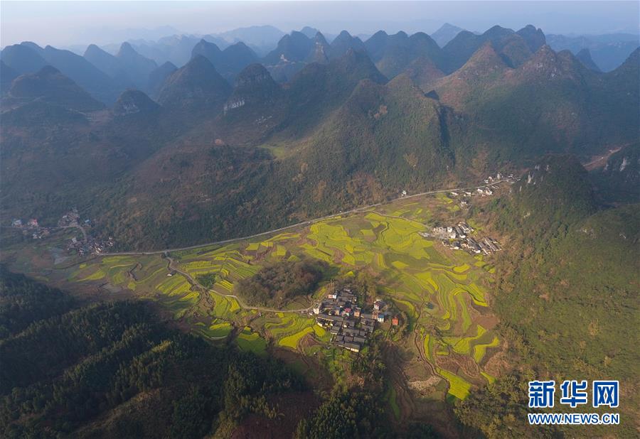 廣西融安縣東起鄉(xiāng)長豐村的田園春色(3月10日無人機(jī)拍攝)。 近日,隨著氣溫持續(xù)回升,廣西融安縣境內(nèi)的油菜花開放,春意盎然。 新華社記者 黃孝邦 攝