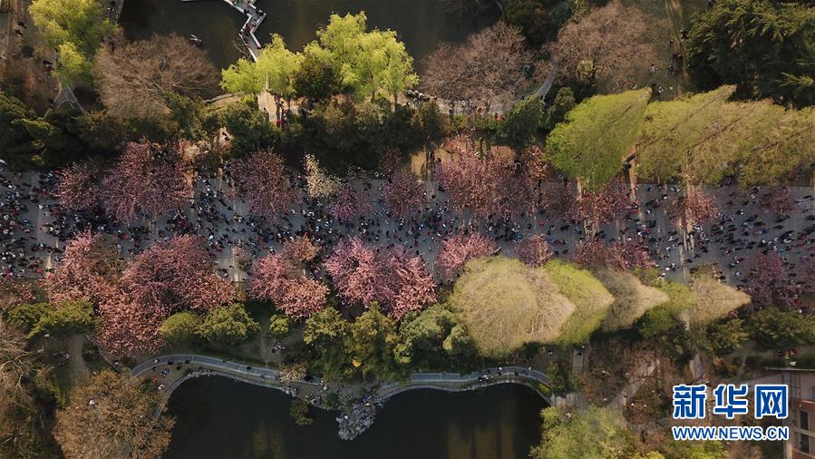 3月31日,游客在中國科學(xué)技術(shù)大學(xué)東區(qū)觀賞櫻花(無人機(jī)拍攝)。
