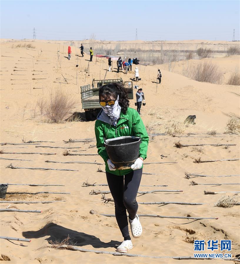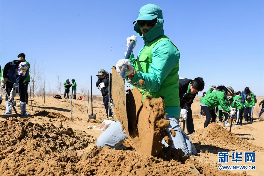 3月31日,中韓青年志愿者在種植新樹。一旁的老樹已經吐出新芽。 當日,200余名中韓兩國青年志愿者來到內蒙古自治區(qū)達拉特旗庫布其沙漠種樹。2006年起,中國國際青年交流中心與韓國韓中文化青少年協(xié)會組織兩國青年志愿者在庫布其沙漠植樹,參與防沙固沙項目。截至目前已植樹850多萬株,造林3萬多畝。 新華社記者 劉磊 攝