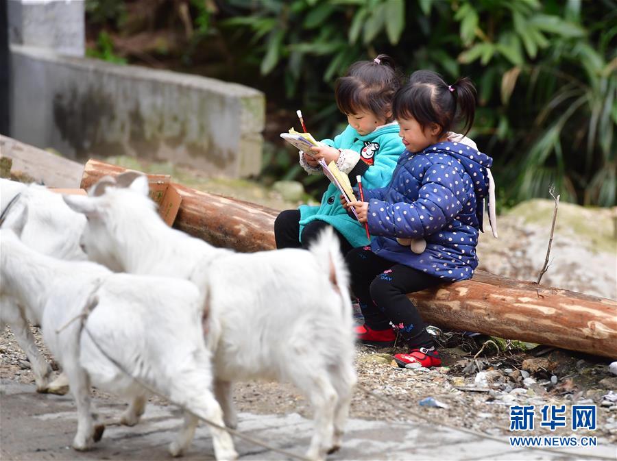 在黔桂烏英苗寨,兩位小朋友在路邊學習(3月26日攝)。