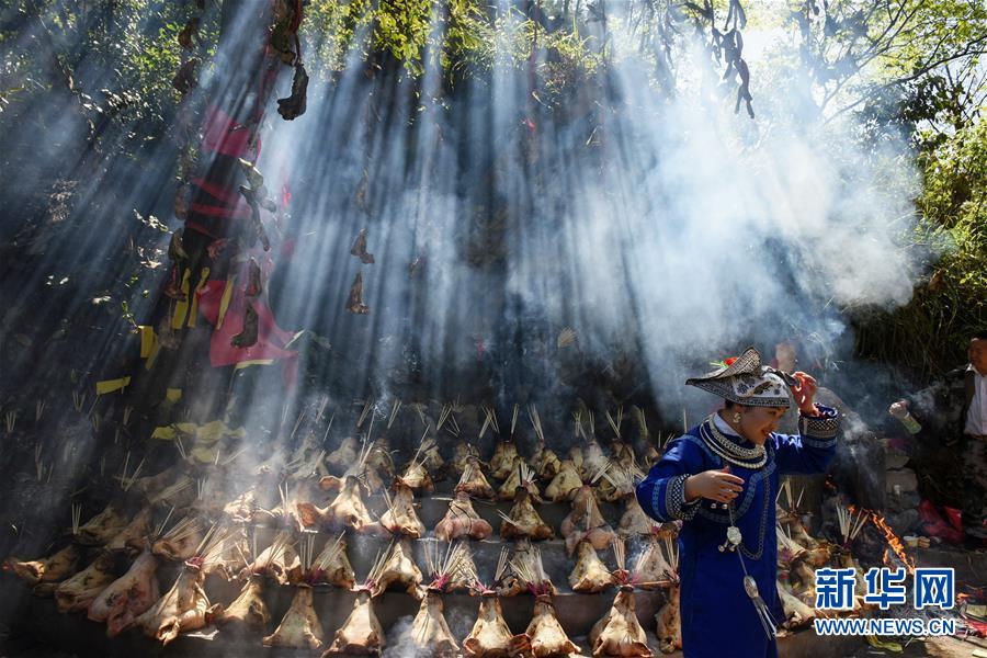4月7日,苗族群眾在參加祭“巫耶”民俗活動。4月6日至7日,在貴州省黔東南苗族侗族自治州劍河縣觀么鎮(zhèn)新民村和新合村,來自劍河縣和三穗縣的苗族同胞歡聚一堂,通過民族歌舞展演、非遺手工藝展示、千戶祭“巫耶”、跳蘆笙舞等形式,與來賓一起歡慶2019年高雍苗族“三月三”民俗文化節(jié)。 新華社記者 楊文斌 攝