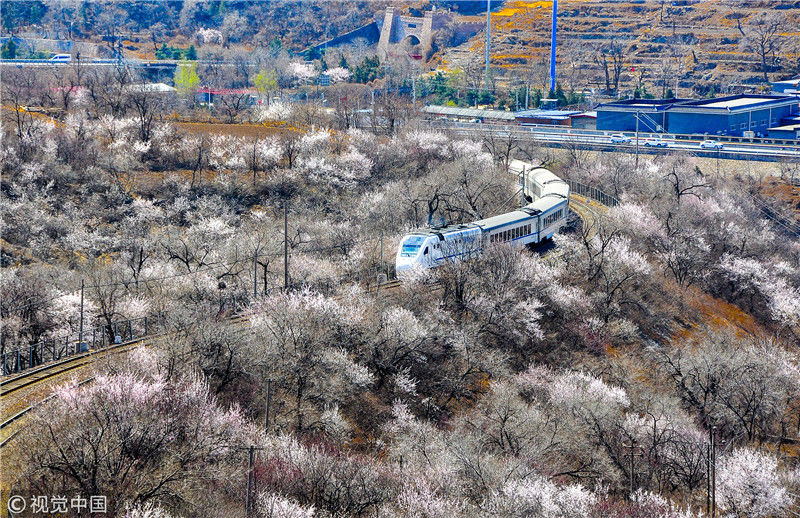 2019年3月22日,北京居庸關(guān)附近的山花盛開(kāi),S2線列車穿行在花海之中,構(gòu)成一幅美麗的畫(huà)面。