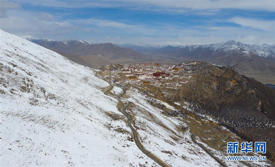 雪后的甘丹寺(4月8日無人機拍攝)。新華社記者普布扎西攝