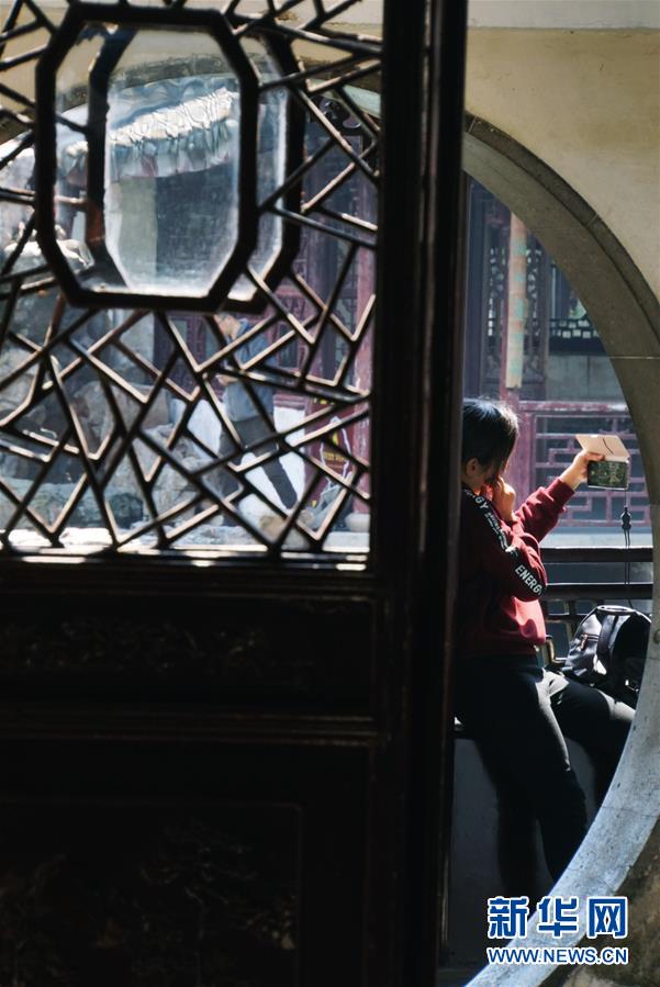 2019年4月1日,游客在中國(guó)蘇州網(wǎng)師園內(nèi)自拍。1997年,網(wǎng)師園和拙政園、留園、環(huán)秀山莊被列入聯(lián)合國(guó)教科文組織世界文化遺產(chǎn)名單。 新華社記者杜涓涓攝