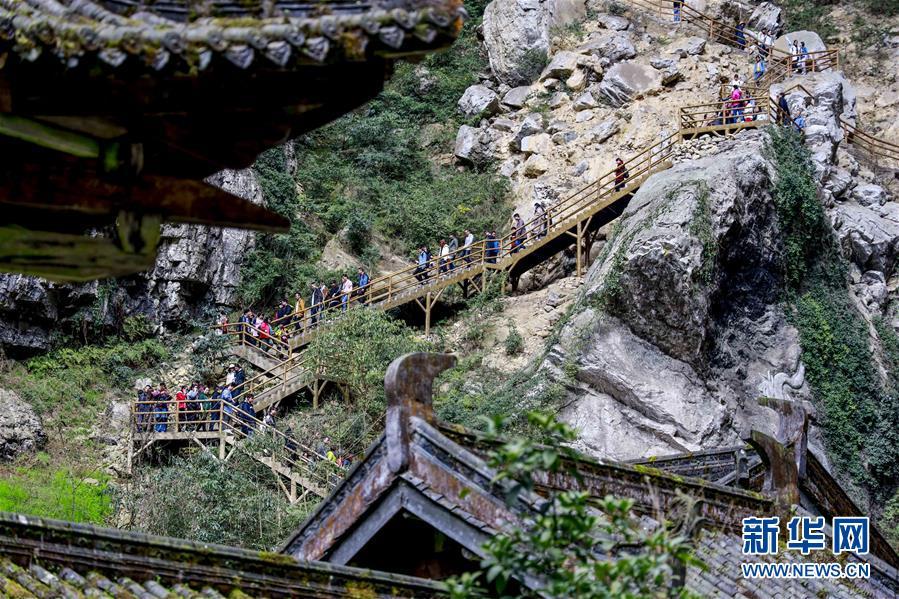 游客在天生三橋景區(qū)內(nèi)的黑龍橋景點(diǎn)游覽(3月27日攝)。 隨著天氣轉(zhuǎn)暖,重慶武隆天生三橋景區(qū)風(fēng)景如畫(huà),氣勢(shì)磅礴的天生石橋和綠意盎然的山林相映成趣,吸引眾多游客前來(lái)踏春賞景。 新華社記者劉潺攝