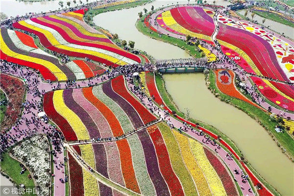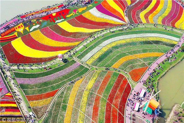 2019年4月6日,江蘇鹽城市大豐荷蘭花海的300萬株郁金香隨風盛開,吸引了眾多市民和游客前來觀賞。從空中看,一片片彩色的郁金香花田仿佛巨幅彩帶,將數(shù)百畝花海裝扮得分外美麗。楊素平/視覺中國