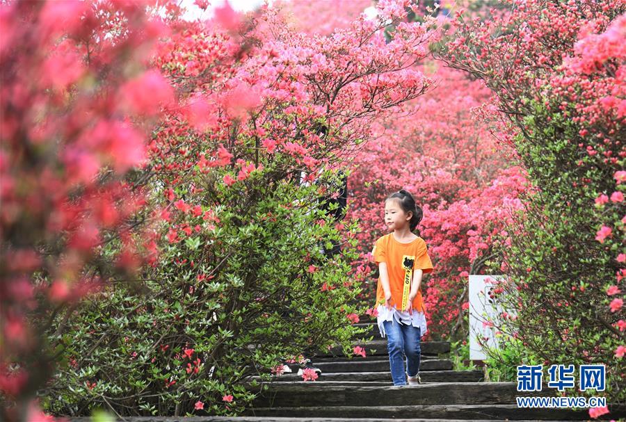 4月25日,游客在龜峰山杜鵑花海中游玩。 近日,湖北省麻城市龜峰山的10萬(wàn)畝古杜鵑盛開(kāi),大量游客前來(lái)賞花觀(guān)景。 新華社記者 程敏 攝