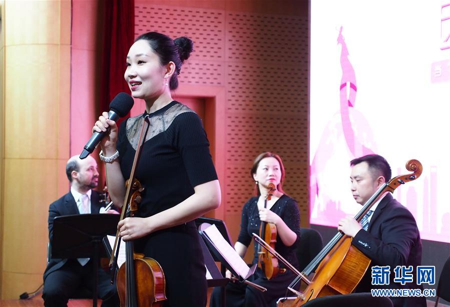 4月25日,上海交響樂團的中提琴手巴桐在演奏前介紹曲目。 當日,第一場“全城交響·上交為你而來”音樂會在復(fù)旦大學(xué)附屬腫瘤醫(yī)院報告廳奏響,為患者及醫(yī)護人員獻上一場專屬音樂會。“全城交響·上交為你而來”是上海交響樂團2019年向全上海的機構(gòu)及個人開放的公益演出項目。 新華社記者 任瓏 攝