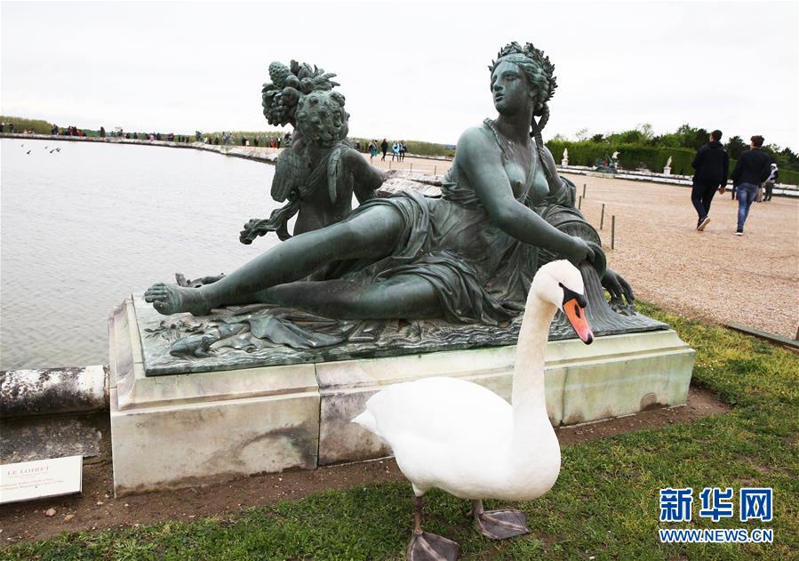 4月25日,在法國巴黎近郊的凡爾賽花園,一只白鵝站在青銅雕塑前。