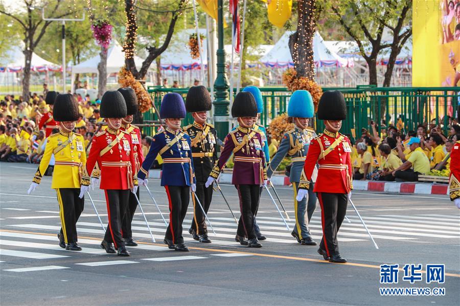 5月5日,儀仗隊(duì)在曼谷大王宮附近舉行的泰國國王加冕典禮巡游上列隊(duì)前進(jìn)。 新華社記者 張可任 攝