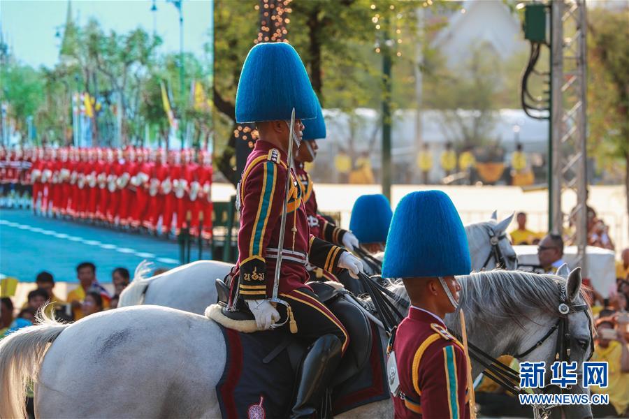 5月5日,儀仗隊(duì)在曼谷大王宮附近舉行的泰國國王加冕典禮巡游上列隊(duì)前進(jìn)。 新華社記者 張可任 攝