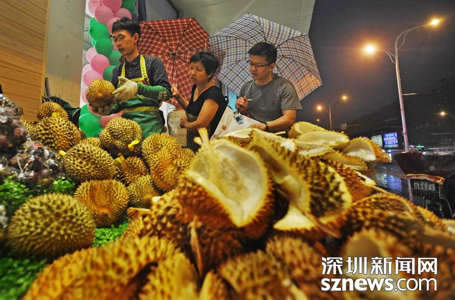 2017年6月5日夜里,武漢一家水果店正進(jìn)行金枕榴蓮打折促銷,門前堆積如山的榴蓮殼頗為壯觀,不少市民聞著榴蓮散發(fā)的濃郁味道前來排隊(duì)選購(gòu),雨夜里食客們依舊絡(luò)繹不絕。