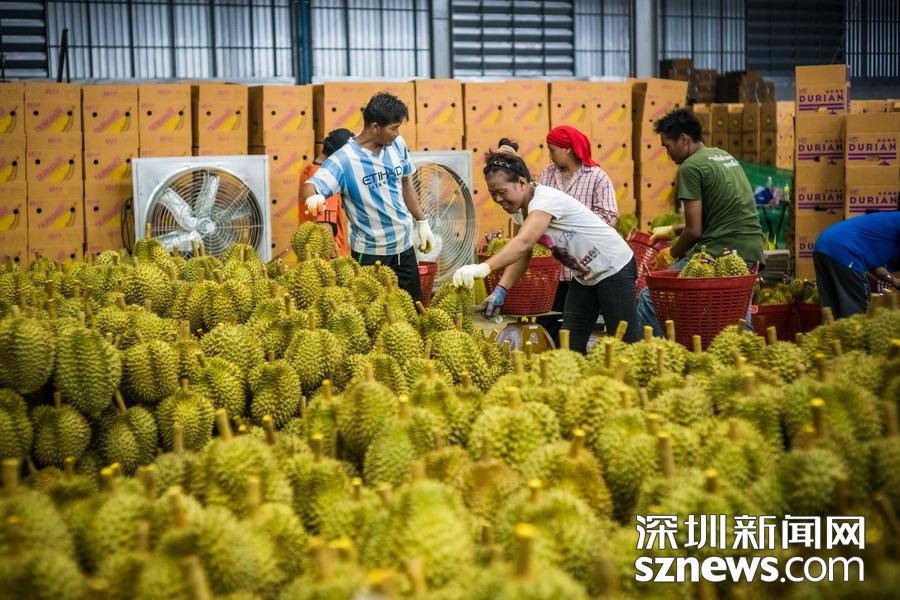 2018年4月20日晚上11點(diǎn),泰國(guó)尖竹汶府的金枕頭榴蓮分裝廠區(qū)內(nèi)燈火通明,工人們正在對(duì)剛摘下來的20多噸榴蓮打包、稱重。
