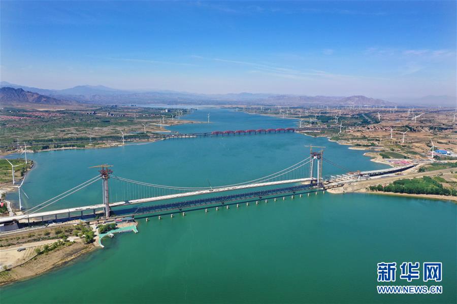 建設(shè)中的官?gòu)d水庫(kù)公路大橋(5月7日無人機(jī)拍攝)。 河北省懷來縣官?gòu)d水庫(kù)公路大橋是懷來沙城至東花園公路的節(jié)點(diǎn)工程,預(yù)計(jì)該橋?qū)⒂?019年6月竣工。 新華社記者 楊世堯 攝