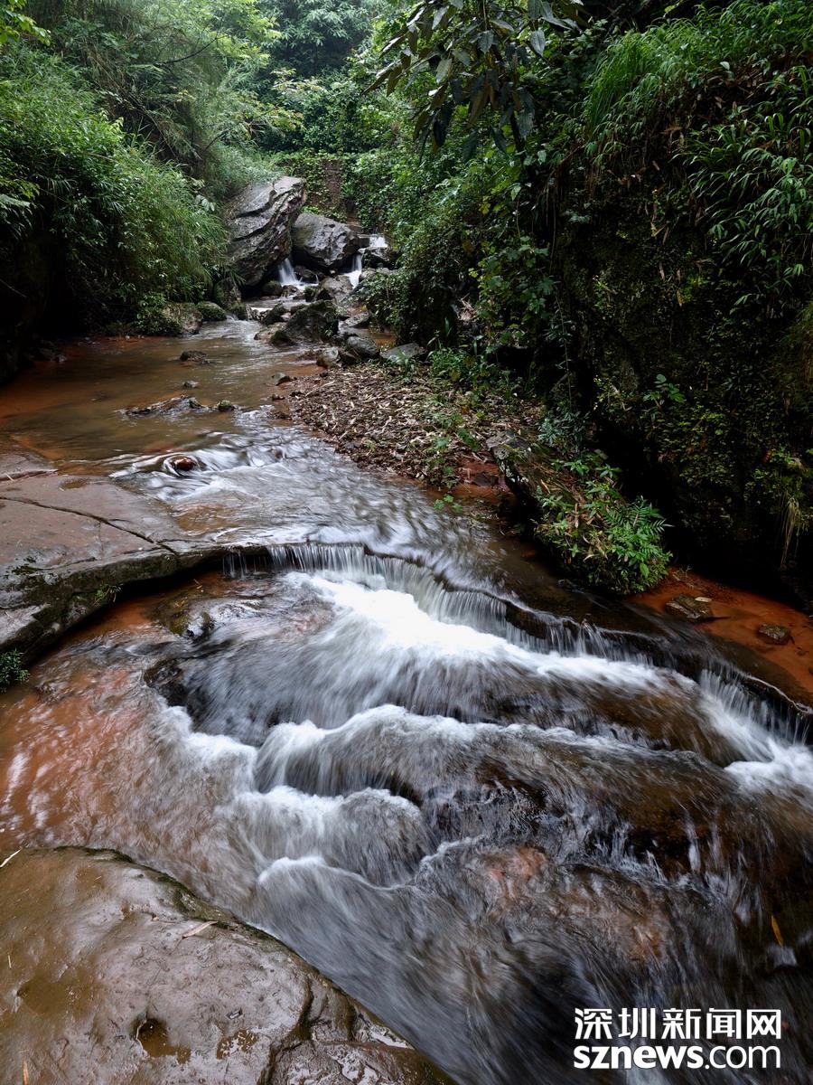 丹霞地貌與大面積古植被和2359 種動(dòng)植物、珍稀瀕危動(dòng)植物共存,是赤水丹霞最獨(dú)特的特征。點(diǎn)綴在原始森林、竹海、桫欏之間,猶如紅寶石鑲嵌在綠洲之中,是世界罕見(jiàn)的綠色丹霞景觀。李仁奇  攝