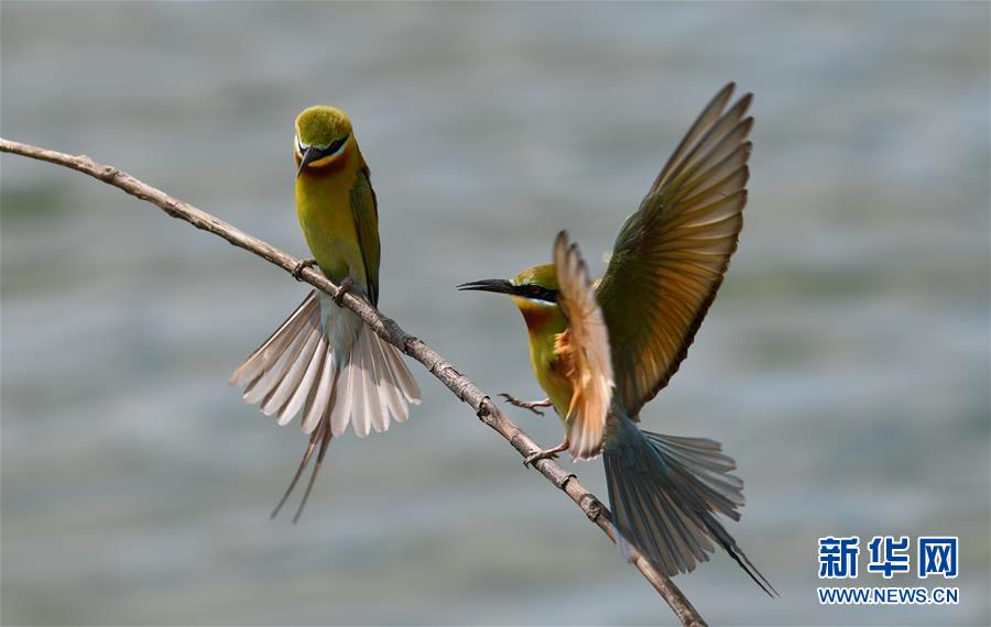 5月14日,兩只栗喉蜂虎在樹枝上嬉戲。